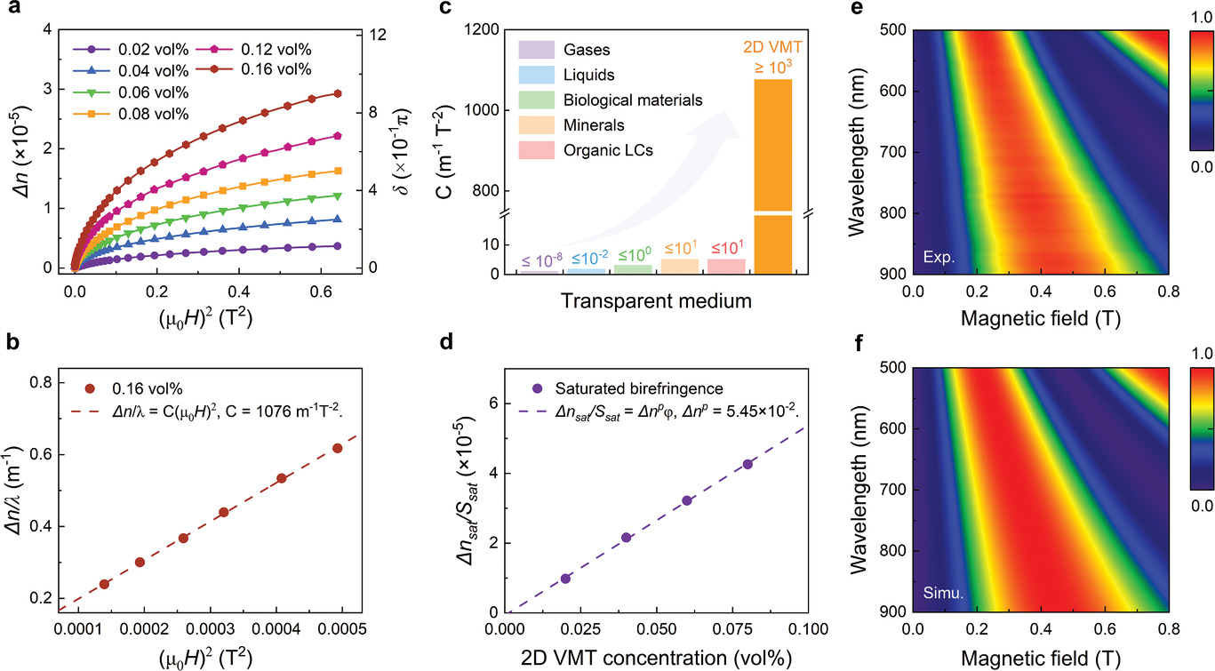 a) 0-0.8 T磁场中不同浓度的二维VMT的磁双折射。b) 浓度为16 vol%的VMT分散液的克顿-穆顿系数𝐶。c) 浓度为0.16 vol%的VMT分散液的克顿-穆顿系数与气体、液体、生物材料、矿物、有机液晶测得的克顿-穆顿系数的比较。d)二维VMT分散液的饱和双折射。(a-d)数据是在650 nm激光照射下采集的。e,f)在光程为16 mm的比色皿中,浓度为0.24 vol%的VMT分散液的透射光强度的实验图和模拟图。(e)和(f)中的色条代表相对光强。