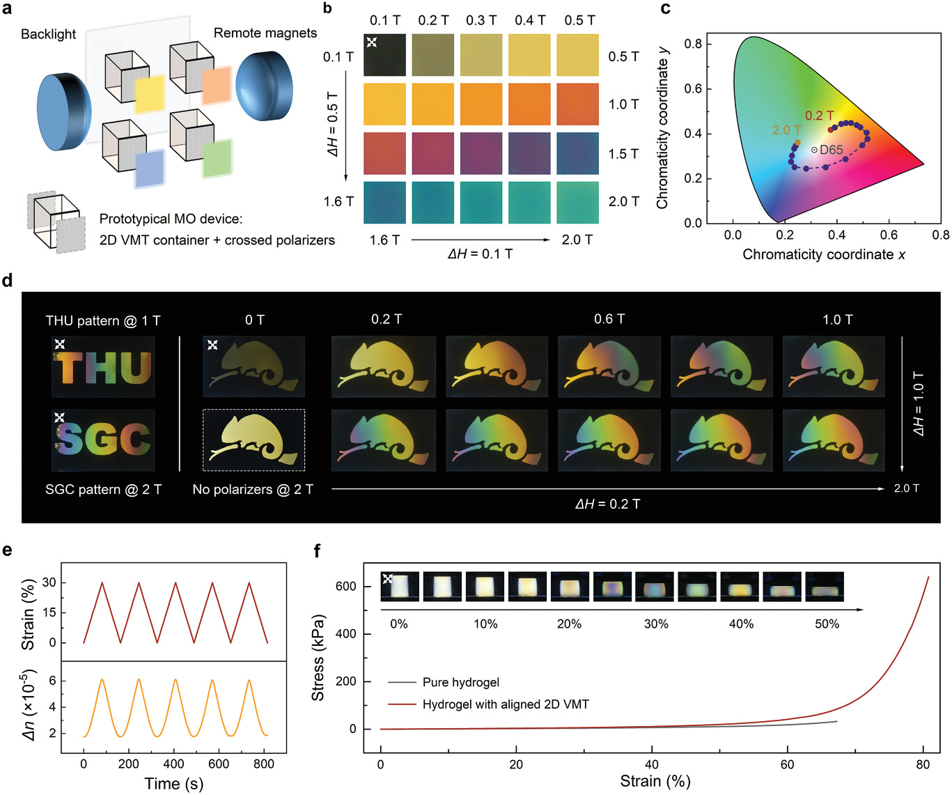 a) 磁光原型器件示意图。b)在1-2.0 T磁场中观察到浓度为0.24 vol% VMT分散液的干涉色。c)在CIE色度图中以坐标表示浓度为0.24 vol% VMT分散液随着磁场的增加颜色的演变。d)在1T和2T磁场下字母THU和SGC的图案和“智能变色龙”对磁场刺激的颜色响应。e)基于二维VMT水凝胶的双折射变化Δ𝑛随应变的变化。f) 纯水凝胶及含有二维VMT的水凝胶的应变-应力曲线。插图: 二维VMT水凝胶对应变刺激的颜色响应,方向垂直于施加的应力。