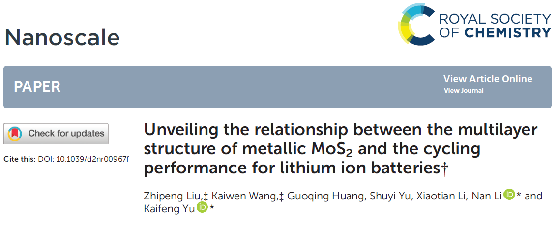 Zhipeng Liu, Kaiwen Wang, Guoqing Huang, Shuyi Yu, Xiaotian Li, Nan Li and Kaifeng Yu, Unveiling the relationship between the multilayer structure of metallic MoS2 and the cycling performance for lithium ion batteries. Nanoscale, 2022.