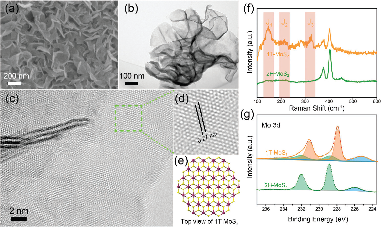 图1 1T-MoS2/Ti的(a)SEM照片;(b)TEM 照片;(c)高分辨TEM 照片;(d)图(c)中所选区域的放大视图;(e) HADDF-STEM照片;(f) Raman光谱和(g) 1T-MoS2/Ti和2H-MoS2/Ti的Mo 3d XPS光谱。