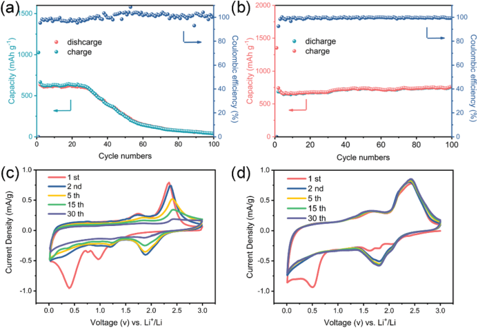 图2 1T-MoS2/Ti和2H-MoS2/Ti的电化学性能。(a)电流密度为100 mA g−1的(a)2H-MoS2/Ti和(b) 1T-MoS2/Ti的循环稳定性和库伦效率;(c) 2H-MoS2/Ti和(d) 1T-MoS2/Ti在0.2 mV s−1扫描速率下的CV曲线。