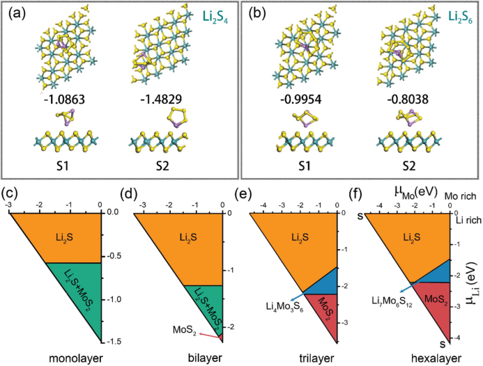 图4 (a, b)多硫化锂(Li2S4和Li2S6)在1T-MoS2吸附位点上的吸附能;(c-f)不同层数锂化金属MoS2的热力学相图。