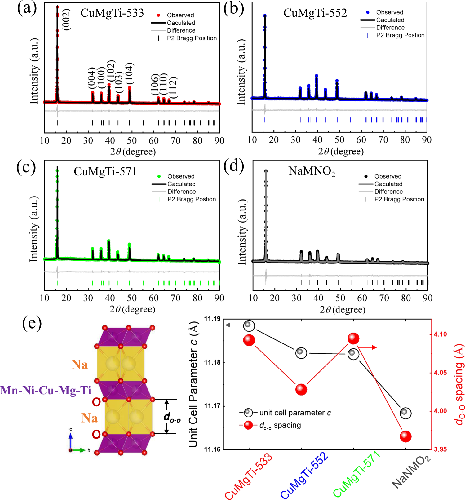 (a)CuMgTi-533,(b)CuMgTi-552,(c)CuMgTi-571,(d)NaMNO2样品的XRD图谱及其对应Rietveld精修图。(e)左图为P2型层状结构的层间距(do-o)原子模型,右图为晶格参数c的取值和以上4种样品的层间距。