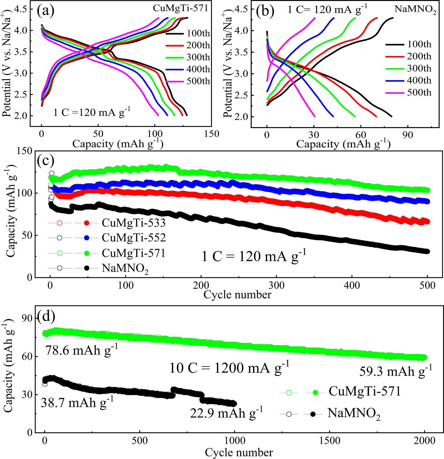 (a)CuMgTi-571与(b)NaMNO2在1 C(120 mA g-1)2.0-4.3 V电压范围内的充放电曲线。(c)CuMgTi-571与NaMNO2在1 C(120 mA g-1)的500次循环性能。(d)CuMgTi-571与NaMNO2在10 C(120 mA g-1)高倍率下的长循环性能。长循环测试在25℃下,以金属Na为负极组装扣式电池进行。(c, d)中的空心圆和实心圆分别代表充电和放电容量。