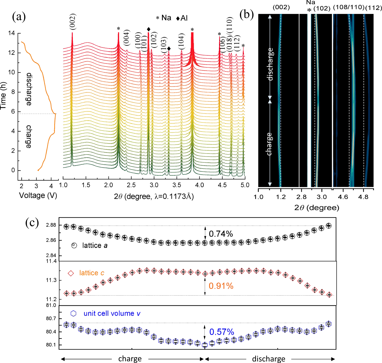 CuMgTi-571正极在2.0-4.3 V电压范围内原位HEXRD的(a)瀑布点图与(b)轮廓点图。(c)充放电过程中电池参数和电池体积的变化。