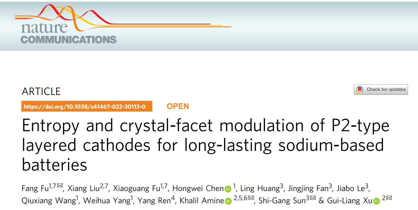 近日,华侨大学付芳副教授、美国阿贡国家实验室徐桂良、Amine教授与厦门大学孙世刚院士(共同通讯作者)等人,提出通过增加熵与活性晶面来制备兼具快充能力与长循环性能的P2型层状氧化物正极材料。所制备的高熵多元素正极材料Na0.62Mn0.67Ni0.23Cu0.05Mg0.07Ti0.01O2 (CuMgTi-571)具有更多的{010}活性晶面,可以有效提高结构和热稳定性,获得更快的阴离子氧化还原动力学。相关研究成果以“Entropy and crystal-facet modulation of P2-type layered cathodes for long-lasting sodium-based batteries”为题发表在Nature Communications期刊上。