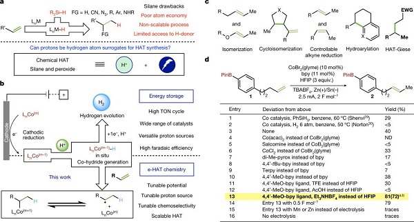 自20世纪60年代初以来,过渡金属氢化物(TMHs)的研究和应用一直是化学领域的重要分支,在储能领域中,TMHs可以实现质子还原制氢;在有机合成中,TMHs能实现不饱和C-C、C-O和C-N键的功能化。自20世纪50年代以来,电化学反应技术就被广泛采用来生成钴氢化物实现制氢反应,但在合成化学中使用外源性的有机和金属还原剂来利用TMHs的能力仍然是常见的做法。例如,钴基TMHs广泛用于复杂分子结构中过渡金属氢化物催化的烯烃和炔烃的衍生化。然而,大规模应用氢原子转移(HAT)化学可能会出现问题,因为需要使用过量的外部还原剂,导致原子经济性较差,以及在同一反应体系中使用有机还原剂和氧化剂时隐含的安全问题等。