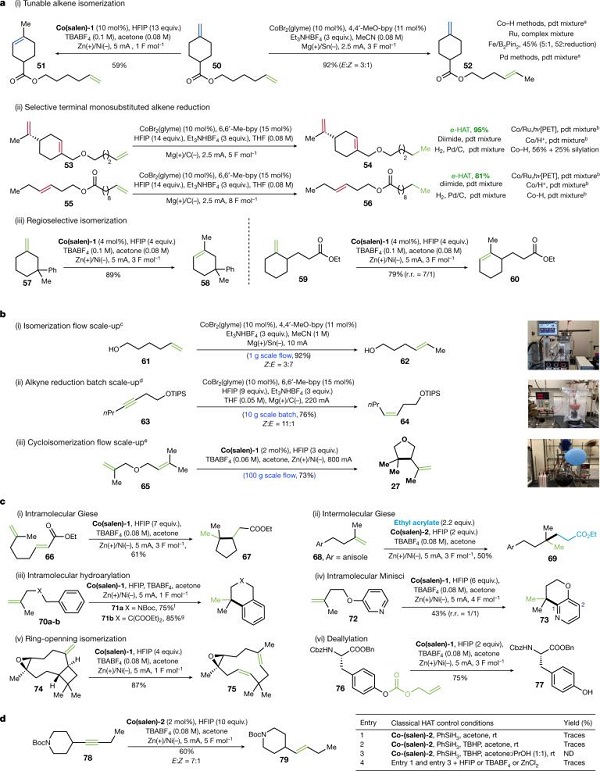 1、受钴电催化析氢化学的启发,研究人员开发了一组高化学选择性的、可调控的e-HAT策略,无需化学还原剂和氧化剂或严格的实验条件。