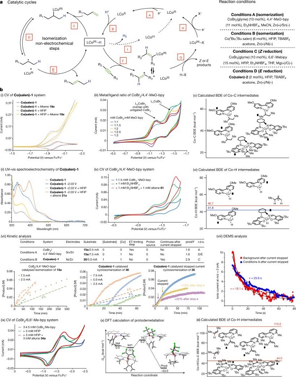 近日,斯克利普斯研究所的Phil S. Baran教授、Donna G. Blackmond教授、犹他大学Matthew S. Sigman教授、Shelley D. Minteer教授、加州理工学院Sarah E. Reisman教授、康奈尔大学Hector D. Abruna教授等联合展示了利用几十年来储能研究所广泛采用的电催化方法来实现有机合成,即高化学选择性的、可控的电化学HAT(e-HAT)。这种策略不仅在可持续性和效率方面提供了好处(无需化学还原剂、氧化剂以及严苛的反应条件),而且还能够增强化学选择性和独特的、可调反应。通过实验举例说明了数十种底物上的十种不同反应,并提供了这种通过低价中间产物生成Co-H的可扩展电化学途径的机理解释。该论文以题为“Cobalt-electrocatalytic HAT for functionalization of unsaturated C–C bonds”发表在知名期刊Nature上。