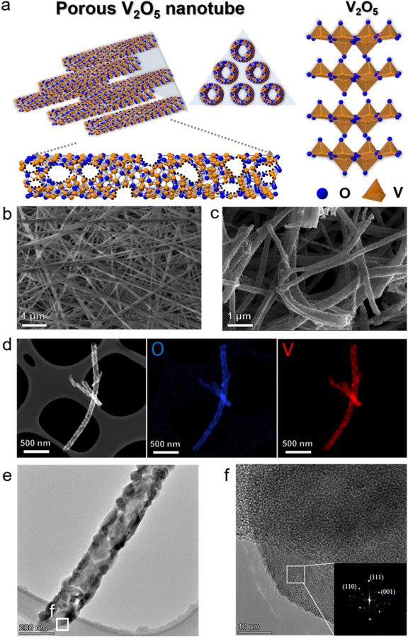 图 1. (a) 多孔 V2O5 的微观结构示意图及其晶体结构。制备的静电纺丝产品 (b) 和煅烧 VNT (c) 在 400℃ 下的 SEM 图像。 (d) VNT 的 STEM 图像和 EDS 分析。多孔 V2O5 纳米管的 TEM (e) 和 HRTEM (f) 图像。 (f) 中的插图是相应的 FFT 模式。