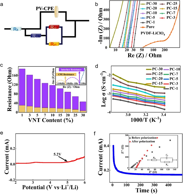 图 3. (a) EIS-AC阻抗法测量电阻的等效电路图。 (b) PV-CPE 和纯 PVDF-LiClO4 电解质膜的 EIS 阻抗图。 (c) 室温下 VNT 含量为 1% – 30% 的 PV-CPE 的体相电阻和界面电阻。 (d) 在不同温度下具有不同 VNT 含量的电解质膜的阿伦尼乌斯光谱。 (e) PC-30 的直流极化曲线。 (f) 通过极化前后的阻抗比较测量 PC-30 的锂离子迁移数。