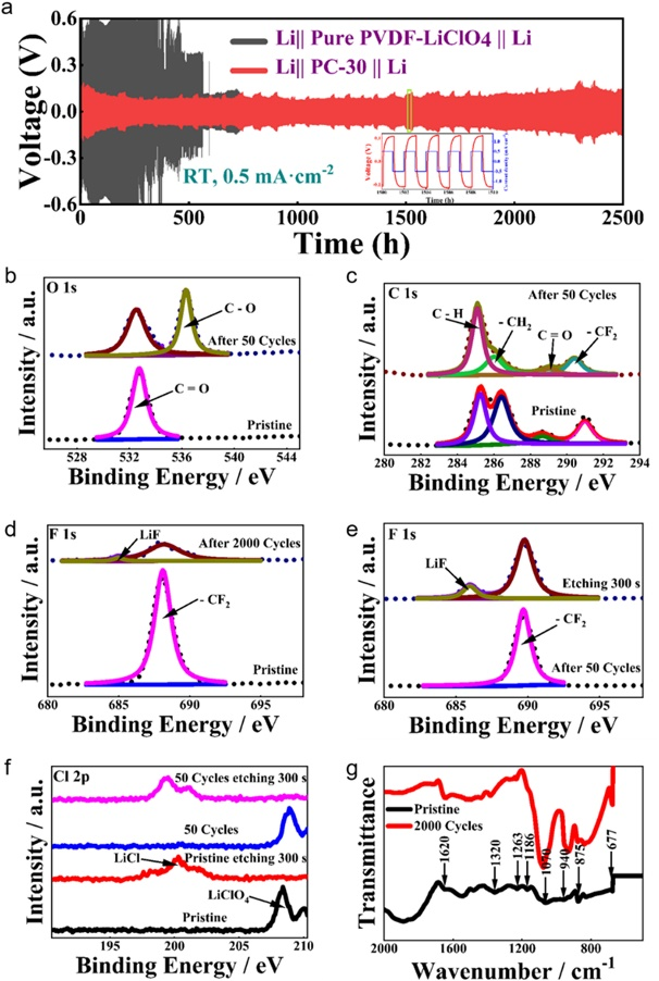 图 4. (a) 纯 PVDF 和 PC-30 CPE 在对称电池上的锂剥离和电镀测试。 PC-30 的 (b) O 1s、(c) C 1s、(d-e) F 1s 和 (f) Cl 2p 的 XPS 光谱。 (g) PC-30 的 FT-IR 光谱。