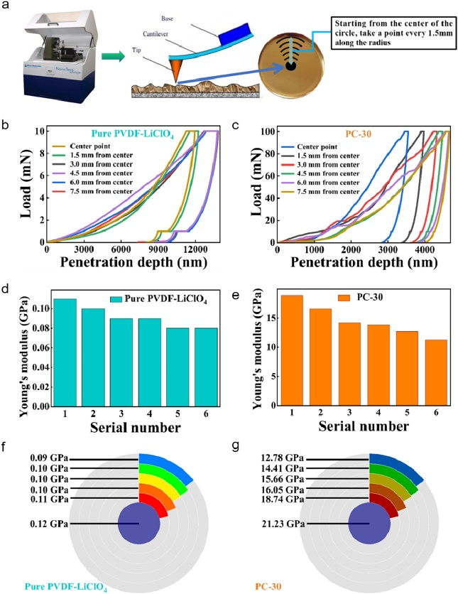 图 5. (a) 纳米压痕测量仪及其工作示意图; Pure PVDF-LiClO4在电解质膜应力-应变曲线上的点选位置(b)、各点的杨氏模量(c)和各部分的剪切模量(d)。 PC-30的应力-应变曲线(e)、每个点的杨氏模量(f)和每个部分的剪切模量(g)