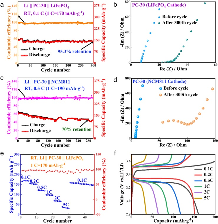 图 6. (a) Li||PC-30||LiFePO4 电池在室温下的性能。 (b) 300 次循环前后的 EIS。 (c) Li||PC-30||NCM811 电池在室温下的性能。 (d) 300 次循环前后的 EIS。 (e) Li||PC-30||LiFePO4电池在室温下不同倍率下的性能。 (f) 不同放大倍率下的容量保持率。