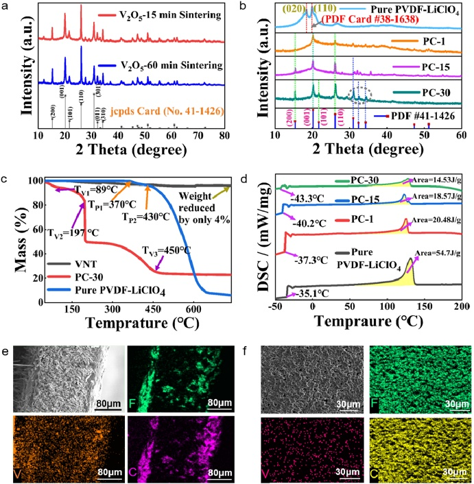 图2. 不同温度下烧结 VNT (a) 和不同 VNT 含量 (b) 的 PVDF 基 CPE 薄膜的 XRD 光谱。 (c) 纯 PVDF-LiClO4、PC-30 和 VNT 的 TGA 曲线。 (d) 不同 VNT 含量的 PV-CPE 的 DSC 曲线。从横截面视图 (e) 和表面 (f) 对 PC-30 进行 SEM 和 EDS 分析。