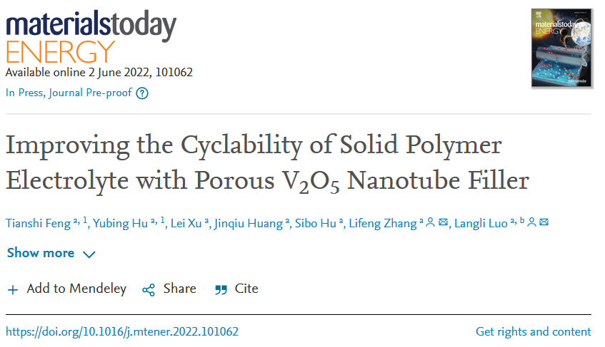 近日,天津大学罗浪里课题组通过静电纺丝方法制备了多孔 V2O5纳米管 (VNT),并将其用作聚PVDF基 SPE 的填料。在 60 °C 时,SPE 的离子电导率可以达到 1.10×10-2 S/cm,同时在室温 (RT) 下保持在 2.2×10-3 S/cm,机械性能得到改善。Li对称电池表现出超过 2500 小时的稳定充电/放电循环。与 LiFePO4 相结合的非对称电池在 0.1 C 倍率下实现了 300 多次循环,容量保持率为 95.3%,当与 NCM811 结合时,在 0.5 C 下实现了 300 多次循环,容量保持率为 70%,均在室温下。循环性能的提高归因于 VNT 填料的精细分散以及 V2O5 引起的 PVDF 晶体碎裂和化学键的改变,这两者都导致锂在复合聚合物电解质中快速稳定的扩散。相关成果以“Improving the Cyclability of Solid Polymer Electrolyte with Porous V2O5 Nanotube Filler”发表在Materials Today Energy上。(https://doi.org/10.1016/j.mtener.2022.101062)
