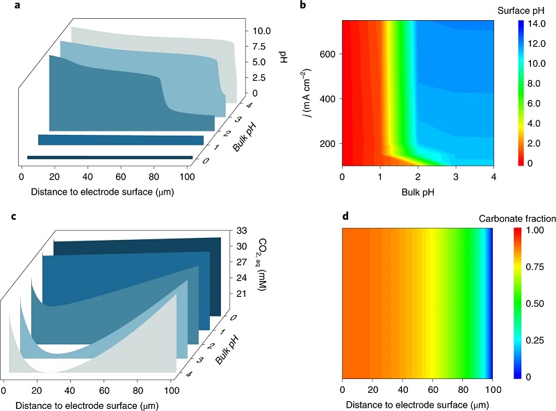 (c-d)不同溶液pH值下CO2的浓度分布和在施加电流密度为500 mA cm-2下溶液中pH =2.0的碳酸盐分数。