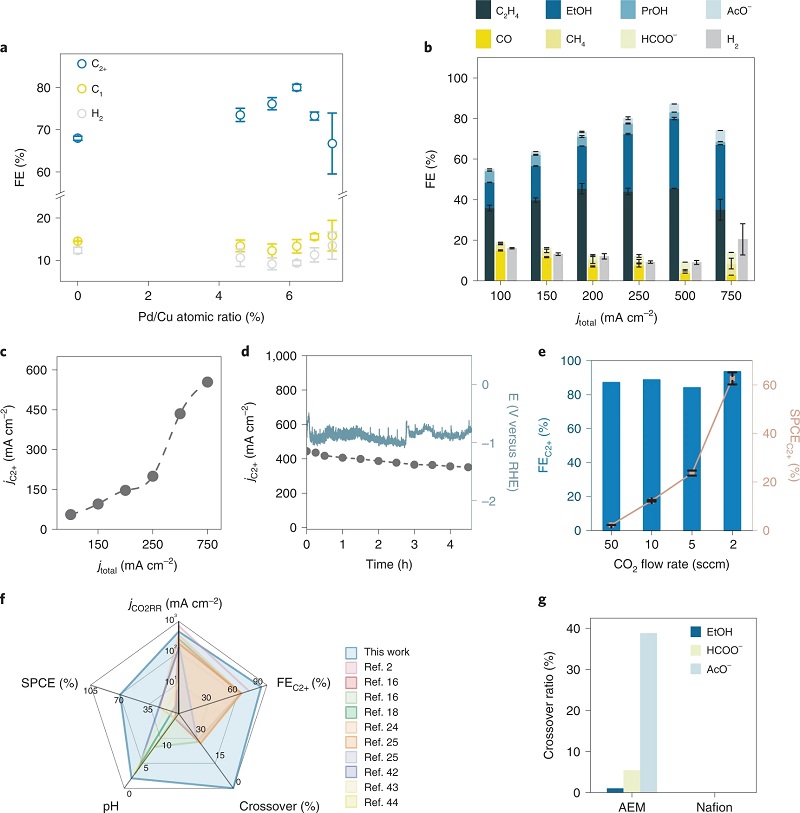 2、Pd-Cu双金属催化剂在电流密度为500 mA cm-2酸性介质中,CO2转化为C2+的FE为89±4%,单程碳效率为60±2%。