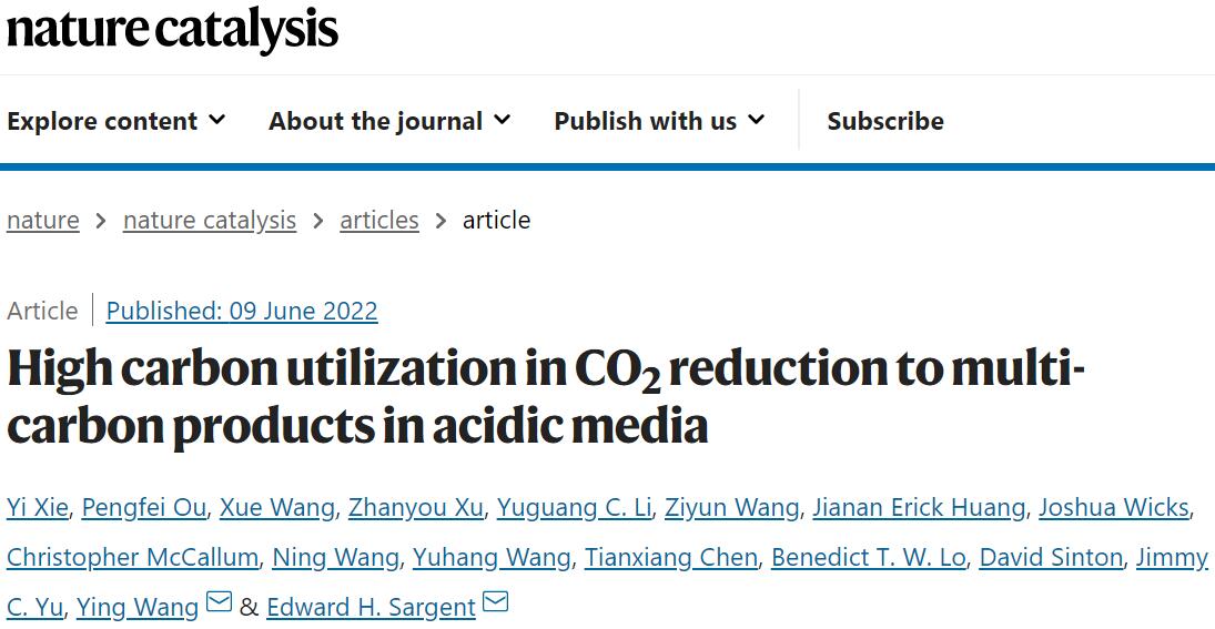 文献链接:High carbon utilization in CO2 reduction to multi-carbon products in acidic media. Nature Catalysis, 2022, DOI: 10.1038/s41929-022-00788-1.