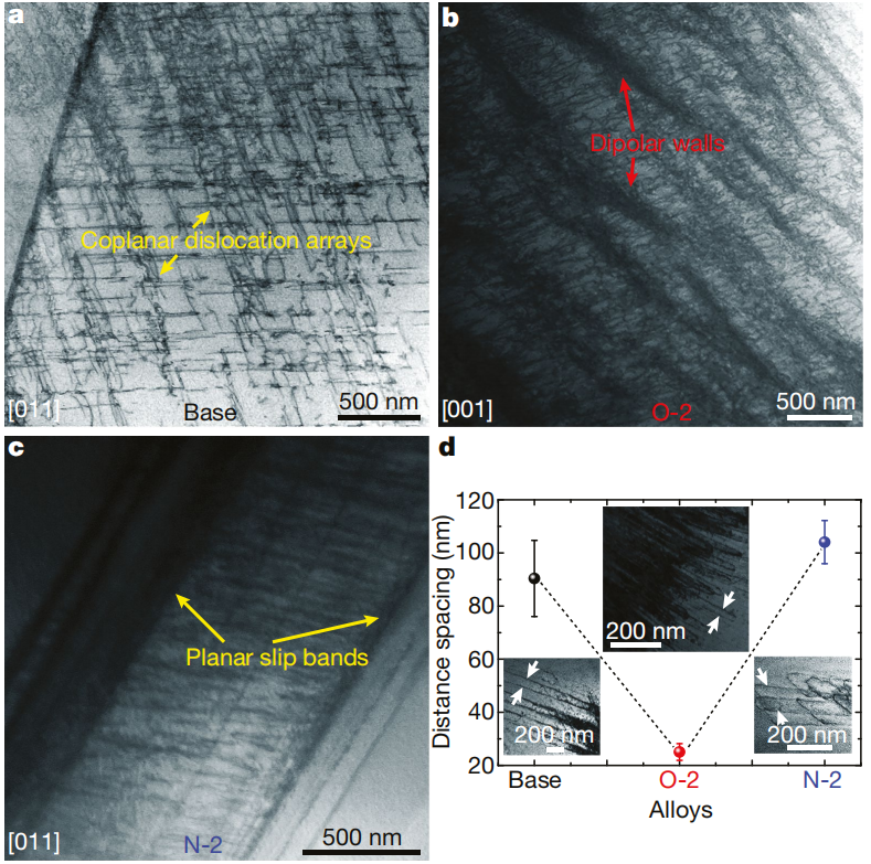 图2 变形机理;a, TiZrHfNb基HEA在8%拉伸应变下的STEM图像(黄色箭头表示共面位错阵列);b, 8%拉伸应变下O-2 HEA的STEM图像(红色箭头表示偶极壁)。c, 8%拉伸应变下N-2 HEA的STEM图像(黄色箭头表示平面滑移带)。在基体HEA和氮掺杂N-2 HEA中观察到典型的平面滑移。而掺杂氧的变体O-2 HEA的变形以波滑为主,表明氧的加入导致了以波滑为主的塑性变形模式。a和c的晶带轴为[011],b的晶带轴为为[001]。d,原位TEM拉伸实验中TiZrHfNb基HEA和间隙掺杂变体O-2和N-2 HEAs的位错间距。白色箭头表示位错间距。O-2 HEA的平均位错间距(25.06 3.15 nm)远小于基底HEA (90.36 14.32 nm)和N-2 HEA (104.06 8.14 nm)。误差条是均值的标准差[3]。