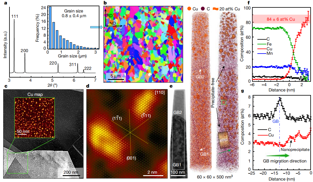 图3 4Cu在760℃退火5min后的显微组织表征;a,同步辐射高能XRD谱图;b,EBSD图显示了具有超细结构的单一fcc相。a中的插图显示了粒度分布。c, ADF-STEM图像显示高密度的颗粒内纳米沉淀物(明亮的颗粒)。插图是标记区域的STEM EDS-SI图像。d,原子分辨率ADF-STEM图像显示了富铜纳米沉淀物的完全共格无序性。e,透射电镜(左)和APT(右)通过两个晶界(GB)的分析显示富铜纳米沉淀物的大小、形态和空间分布。f,距离直方图,显示了一个纳米沉淀物的成分变化(e中的绿色方块标记)。g, e中的圆柱形区域的一维浓度剖面,在晶界处没有明显的元素偏析[4]。