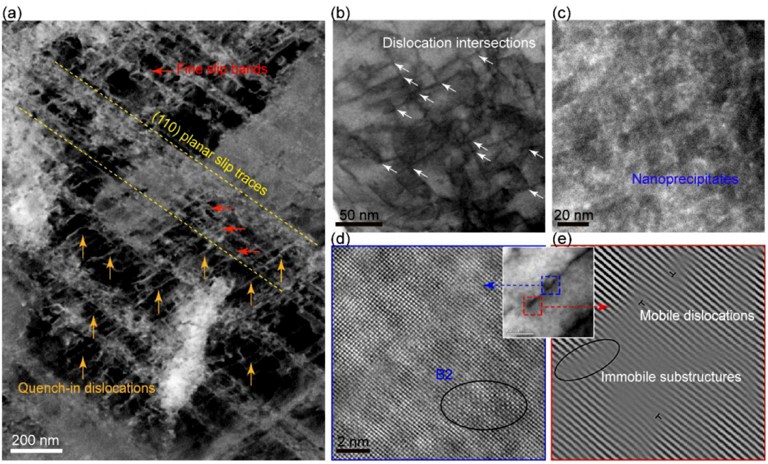 图4 ECCI和STEM分析表明,时效后3Al钢的空间带组织应变为4%;(a)高倍ECCI图像,检测到多个不同带宽的平面滑移带;(b), (c)典型的BF(亮场)图像和对应的HAADFSTEM图像,分别显示出频繁的位错相交和高密度析出相的保留。(d)高分辨率HAADF STEM图像,显示恢复的位错附近析出物的周期性原子柱结构,用椭圆突出显示。插图是低倍STEM图像,显示了析出相的位置。 (e)图中箭头所示区域的IFFT模式,显示了不同类型的位错[5]。