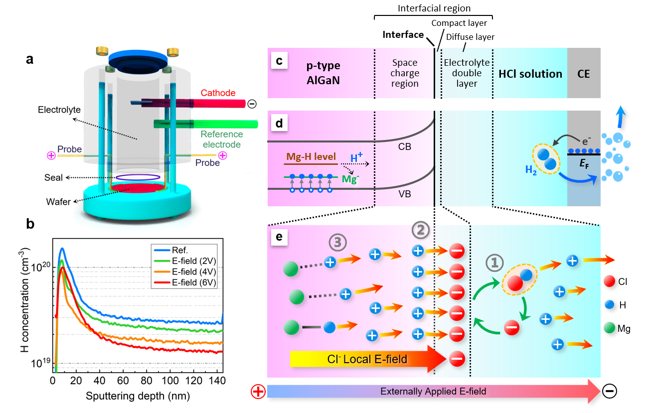 图1. (a) 新型电场除氢装置示意图;(b) 在不同电压下电场除氢后p-AlGaN样品的H杂质浓度SIMS深度测试;(c)-(e) 氯离子电场除氢机理分析,HCl溶液与半导体的界面示意图 (c),能带结构图 (d),循环除氢过程示意图 (e)。