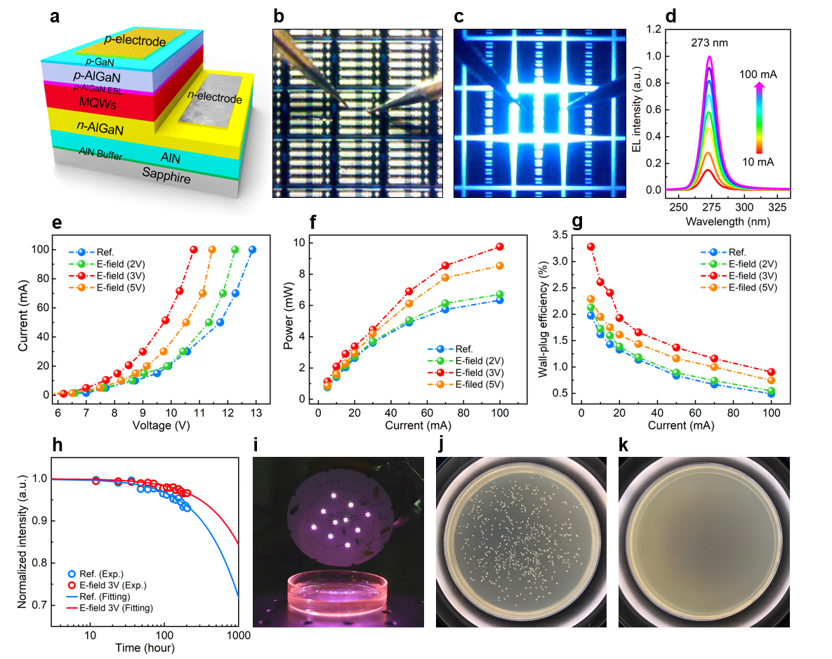图2 (a) UVC LED结构示意图;(b)-(c) UVC LED点亮的显微照片;(d) EL光谱;(e) I-V特性曲线;(f) 输出光功率;(g) WPE插墙效率;(h) 寿命测试结果;(i) 深紫外消杀灯实物照片;(j) 未经深紫外灯消杀,及 (k) 经过深紫外灯消杀后的大肠杆菌培育照片。