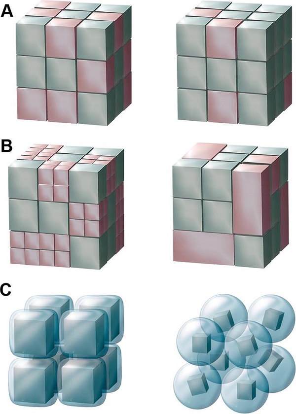 (A)形貌完全相同的两种纳米颗粒构成的介晶(B)形貌不同的两种纳米颗粒构成的介晶(C)溶剂化层对于介晶形成的影响