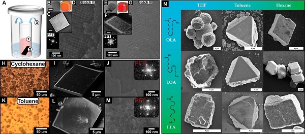 (B-M)纳米颗粒形貌对于组装产物的影响。这里展示了两个具有不同截角程度的Fe3O4立方体最终组装成不一样的介晶形貌(B-G),以及溶剂对于组装形貌的影响(H-M)
