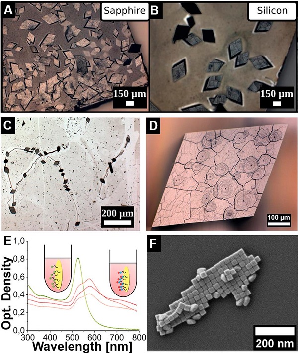 (A-C)抛光蓝宝石衬底、硅衬底以及划伤的硅衬底上形成的Fe3O4立方体介晶的光学显微镜图像(单个Fe3O4立方体颗粒尺寸为大概11nm)。