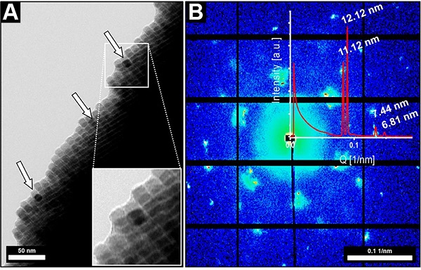 (A)在断裂二元介晶,可以看到Pt纳米立方体(箭头所示)掺杂在断裂Fe3O4介晶中。