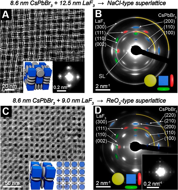 (A-B)由8.6 nm CsPbBr3纳米立方体和12.5 nm LaF3纳米盘形成的二元介晶。