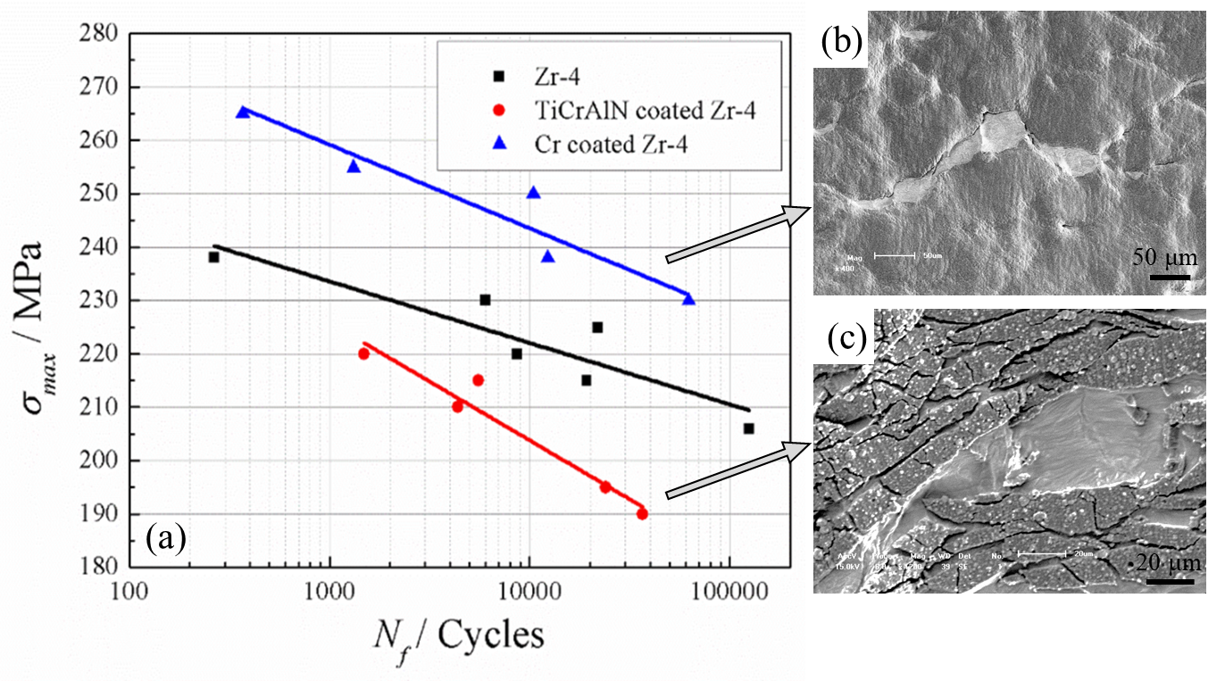 图1. 不同耐事故涂层对锆合金疲劳性能的影响:(a)原始锆合金和含涂层样品的疲劳应力-寿命曲线,(b)Cr涂层表面裂纹形貌,(c)TiCrAlN涂层表面裂纹形貌