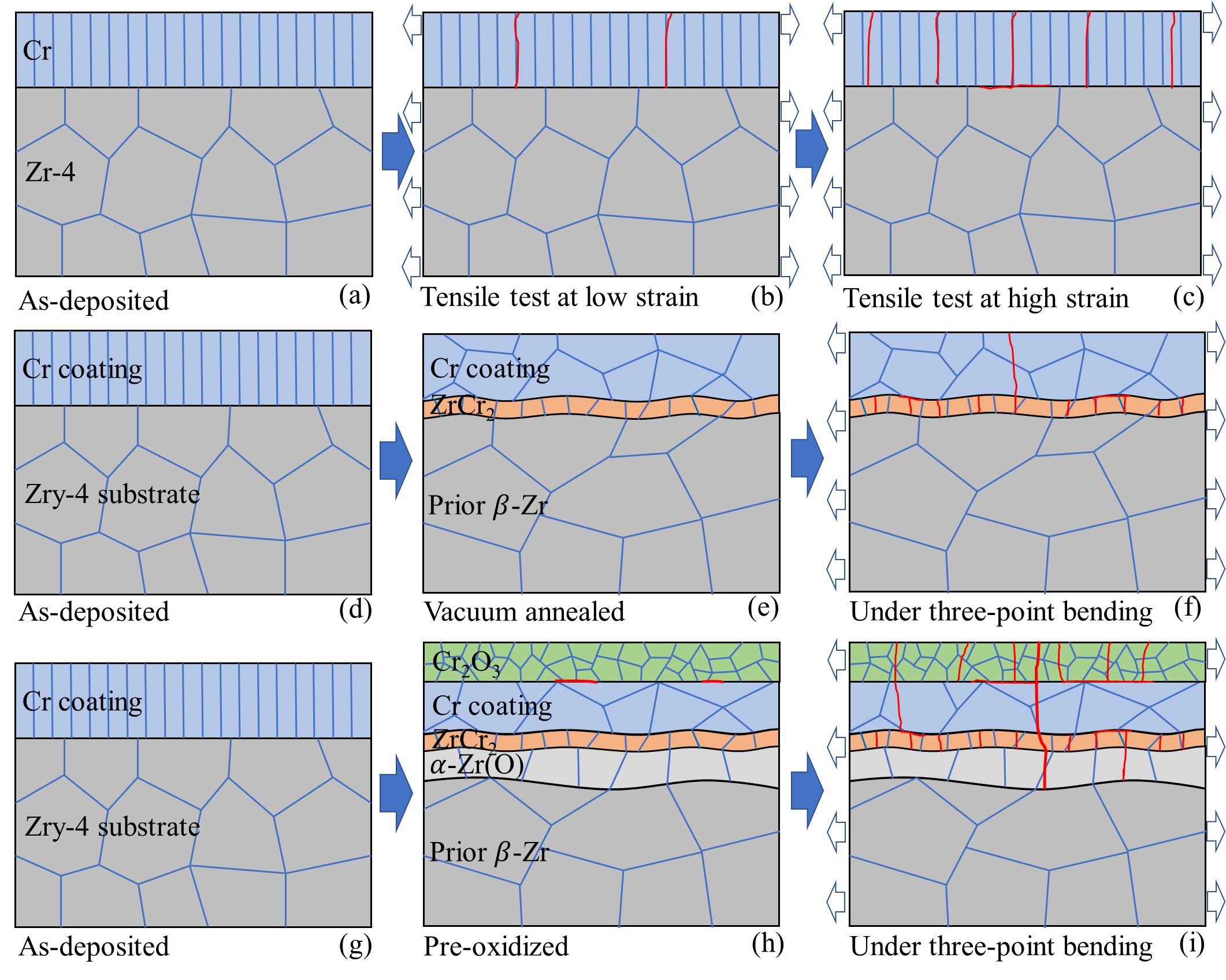 图4. 外载下的涂层基体失效机制示意图:(a)-(c)原始态;(d)-(f)真空退火态;(g)-(i)预氧化态