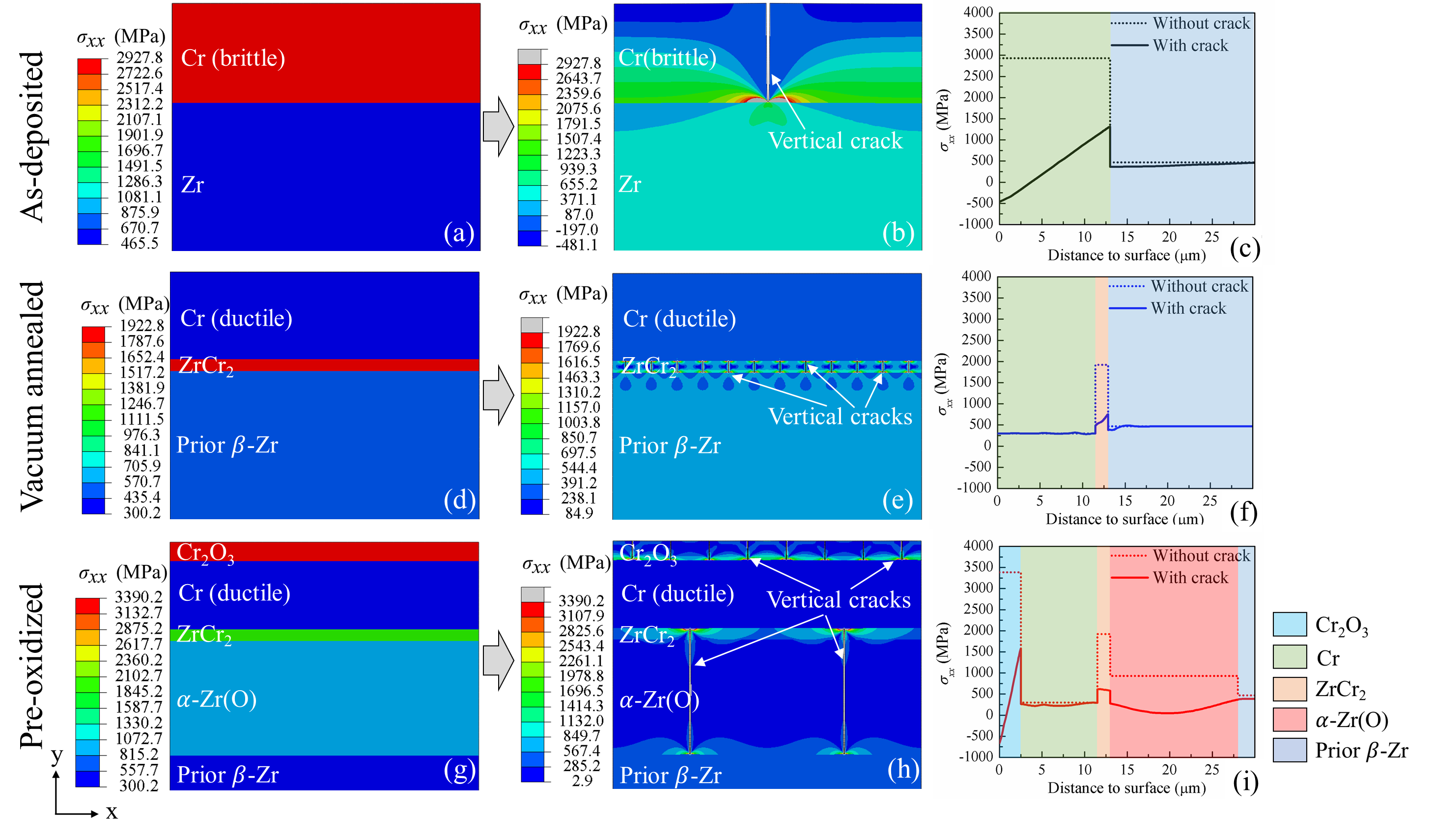 图3. 外载下的涂层-基体应力分布结果:(a)-(c)原始态;(d)-(f)真空退火态;(g)-(i)预氧化态