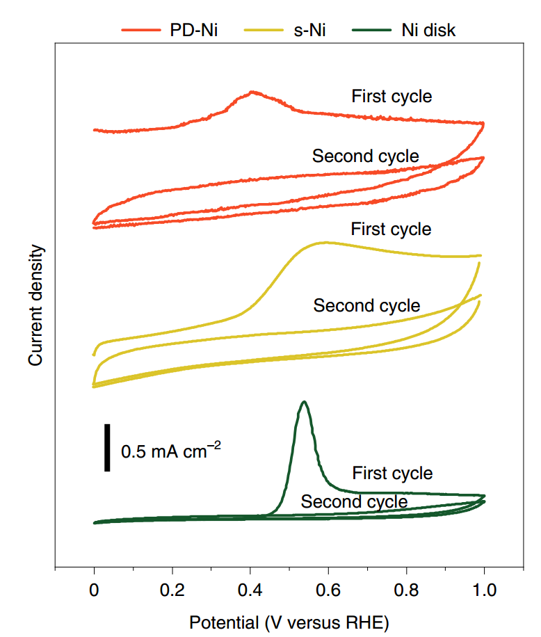 Ni盘、s-Ni和PD-Ni电极的CO溶出曲线。与 RHE相比,CO吸附在-0.8 V下测量。