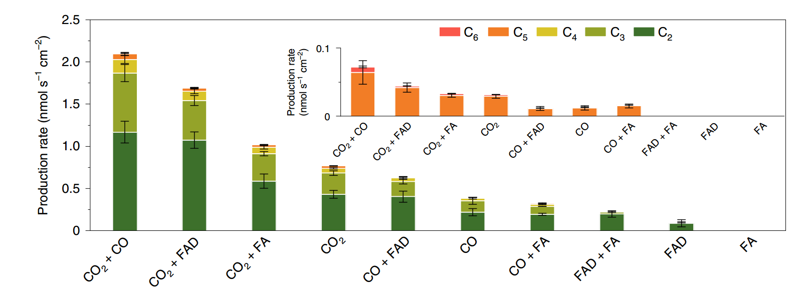 在PD-Ni电极上将选定的C1化合物电催化还原为多碳产物。误差棒代表三个独立测量的标准偏差。