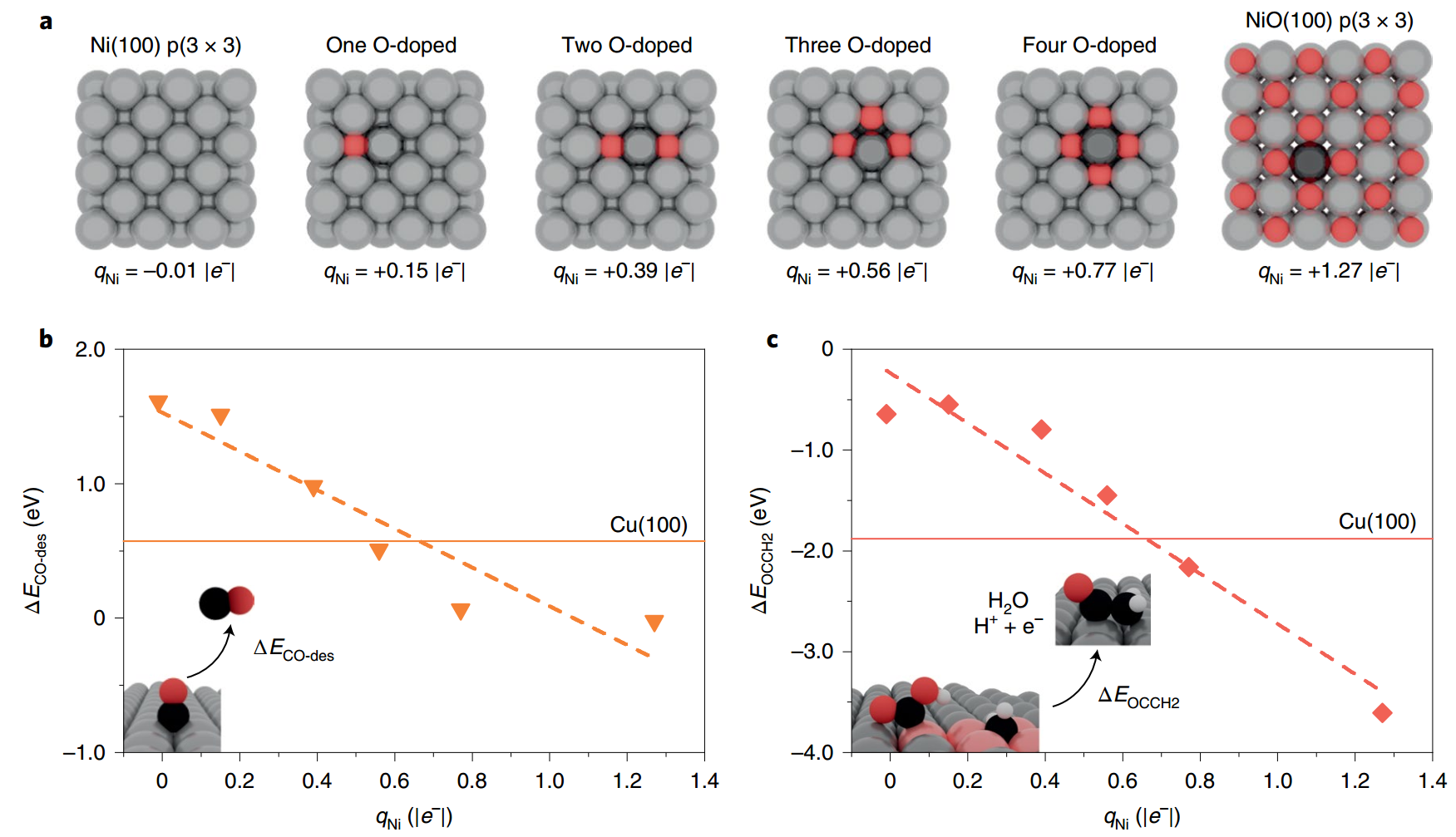 (a),Ni(100) p(3 × 3)、一到四个O掺杂Ni(100) p(3 × 3)和NiO(100) p( 3 × 3) 超级胞。(b),CO解吸能(ΔECO-des)与Ni吸附位点的极化。(c),*CH2 + *COOH耦合的OCCH2形成能(ΔEOCCH2)与在外加电势U = –1.2 V与RHE下Ni吸附位点极化的关系。