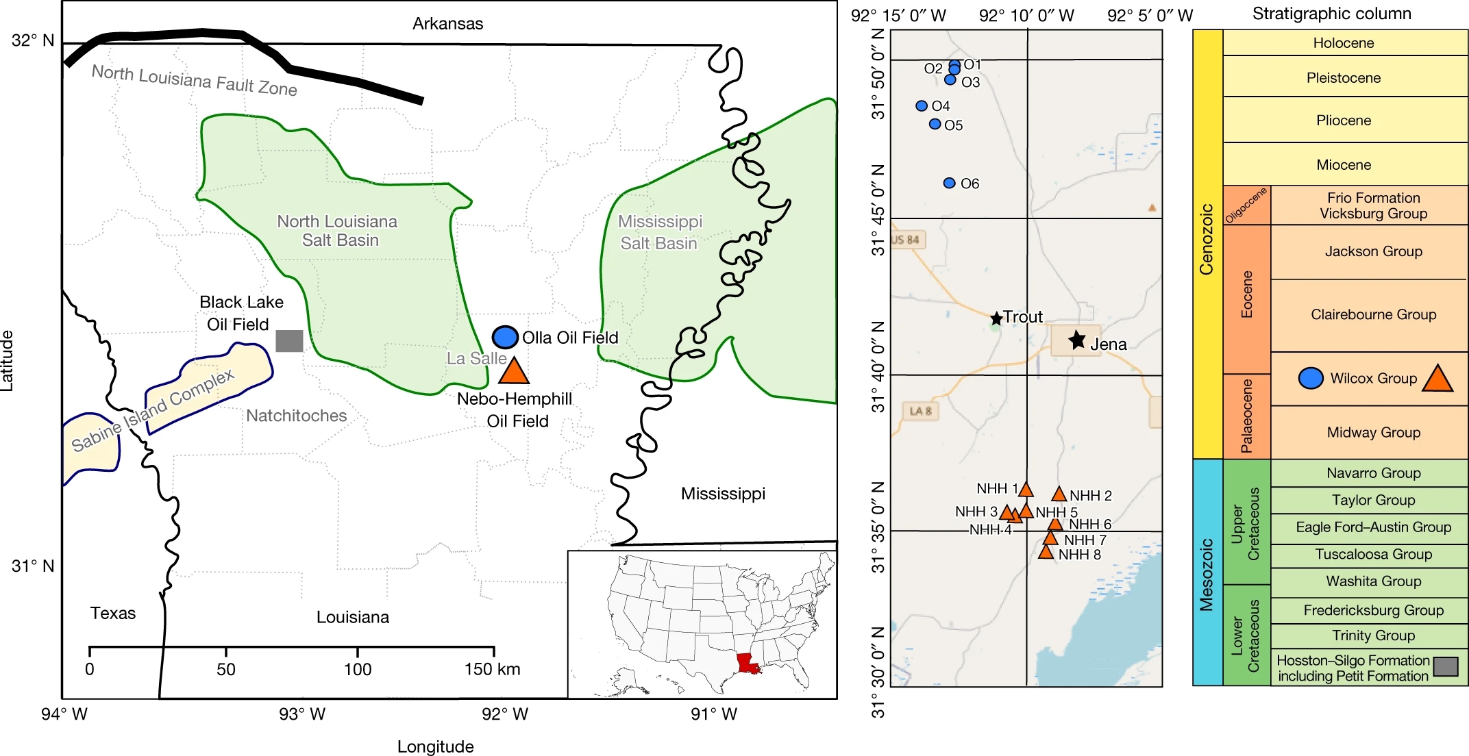 图1 Olla和Nebo-Hemphill油田以及注入二氧化碳的黑湖油田的位置。