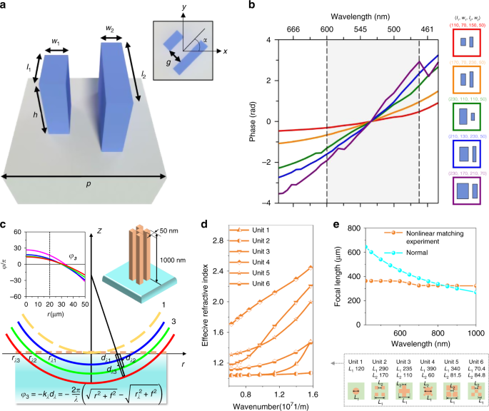 超透镜的设计通常包括三个步骤: (i) 设计目标相位分布;(ii) 构建纳米结构相库;(iii) 使目标相位与纳米结构相匹配。特别是在步骤(ii)中,有多种方法可以通过调整间原子的几何参数来控制局部相位,通常通过参数扫描获得纳米结构相位库。
