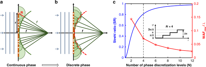 (1)由于基本的相位离散和衍射限制,高聚焦效率对高数值孔径超透镜来说是一个挑战;