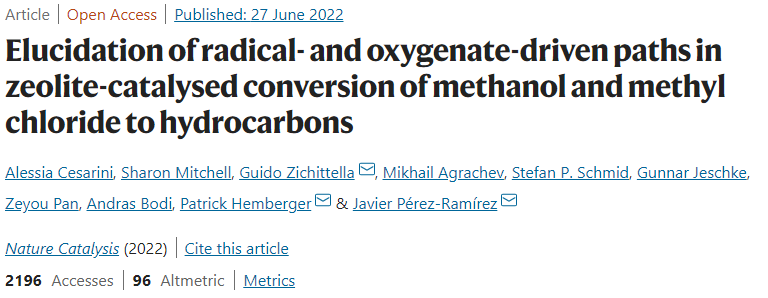 瑞士苏黎世联邦理工学院Guido Zichittella、Patrick Hemberger与瑞士保罗谢勒研究所Javier Pérez-Ramíre课题组合作,使用操作光电子光离子符合(PEPICO)光谱技术,实现对尺寸高达C14的碳氢化合物路径的异构体选择性识别,为反应中的甲基自由基和甲醇制烃反应中的烯酮提供了直接的实验证据。Operando PEPICO强调了焦炭前体普遍存在的差异,这得到了电子顺磁共振测量的支持,为积累的碳质物质的代表性分子结构、密度和分布的差异提供了证据。 氯甲烷-烃反应中的自由基驱动途径加速了扩展芳烃体系的形成,导致快速失活。相比之下,在甲醇制烃反应中通过含氧化合物驱动的途径生成烷基化物质可延长催化剂寿命。本工作所提出的方法有可能为复杂的反应网络提供有价值的机理见解。相关论文以题为:“Elucidation of radical- and oxygenate-driven paths in zeolite-catalysed conversion of methanol and methyl chloride to hydrocarbons”发表在Nature Catalysis上。