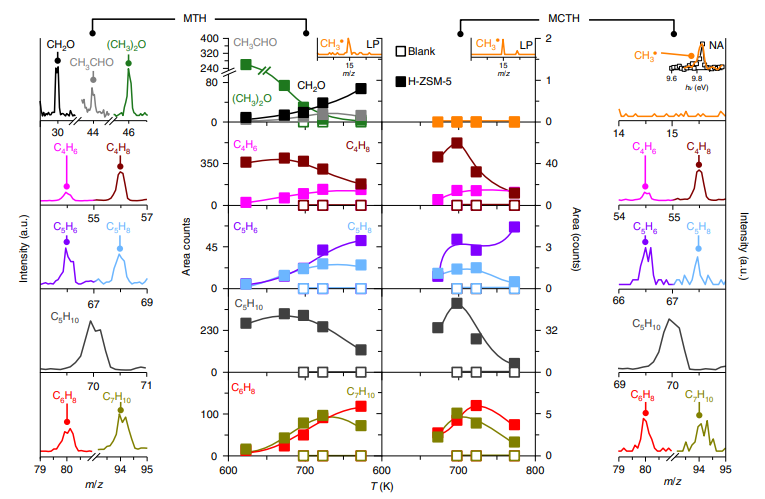 Operando PEPICO分析使本工作能够详细了解在相关条件(T≤773 K,P≤0.5 bar)下H-ZSM-5反应中形成的中间体和产物,显示范围广泛的烃类(C1-C14)在MTH和MCTH过程中以及仅在MTH反应中的氧合物(C1-C4)(图3-5)。实验证实了在MTH 和MCTH反应中都存在CH3•物质。在接近环境压力下检测到 CH3•自由基表明,这些物质在实际条件下是反应性中间体,而不仅仅是来自表面甲氧基物质或仅仅是旁观者的少量解吸副产物。在MTH过程的早期阶段通过CH3OH脱水生成(CH3)2O,而CH3CHO可能连续参与了第一个C-C键的形成。 相比之下,CH2O的形成随温度持续上升在MTH反应的低压实验中观察到相同的趋势,尽管产生的CH2O的量要高得多。这表明CH2O主要参与烃类演化的第一步,而不是参与焦炭前体的生成。