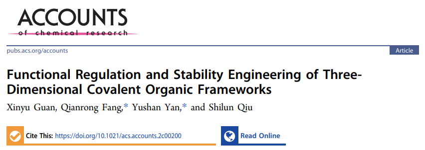文献链接: Guan X, Fang Q, Yan Y, et al. Functional Regulation and Stability Engineering of Three-Dimensional Covalent Organic Frameworks [J]. Accounts of Chemical Research, 2022. https://pubs.acs.org/doi/10.1021/acs.accounts.2c00200.