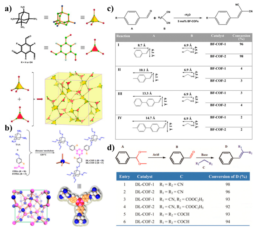 图2. (a) BF-COF 的示意图。 (b) BF-COFs 在 Knoevenagel 缩合反应中的催化性能。(c)DL-COF 的示意图。 (d) 催化性能DL-COFs 在酸碱催化的一锅级联反应中的应用。© 2022 The Authors