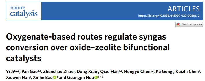 近日, 中科院大连化学物理研究所侯广进研究员在权威期刊NATURE CATALYSIS 上发表了一篇题为“Oxygenate-based routes regulate syngas conversion over oxide–zeolite bifunctional catalysts”的文章, 本文以 ZnAlOx/H-ZSM-5复合材料为模型, 结合准原位固态核磁共振(ssNMR)和气相色谱法/气相色谱-质谱法联用(GC/GC-MS)分析, 研究了双功能催化体系的合成气转化反应机理, 还对不同中间体的反应活性及其演化进行了详细的探讨, 揭示了该机理在合成气转化中的普遍性。