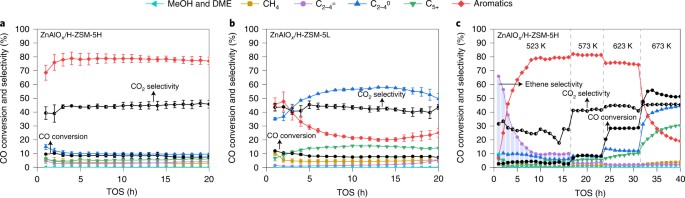 图1 | ZnAlOx/H-ZSM-5在合成气转化中的催化性能. @ NATURE CATALYSIS