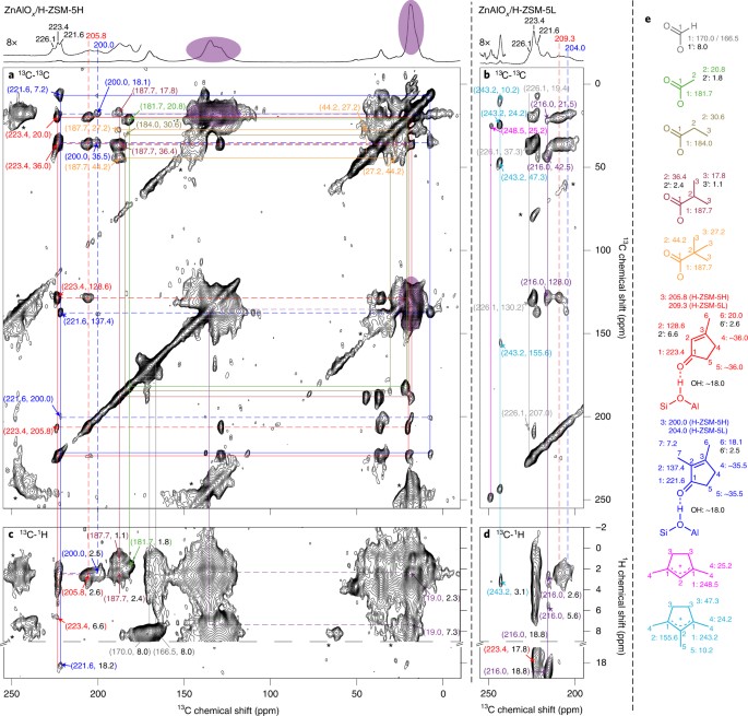 a, 13C-合成气加入到ZnAlOx/H-ZSM-5H上4 h后获得的吸附物种的13C-13C CORDxy4相关核磁共振谱; b, 在ZnAlOx/H-ZSM-5L上; c , 13C-合成气加入到 ZnAlOx/H-ZSM-5H 上4h后获得的吸附物种的13C-1H HETCOR 核磁共振谱; d, 加入到ZnAlOx/H-ZSM-5L; e, 根据相关的固体核磁共振谱分配的典型吸附物质(羧酸盐、 MCPenones 和 MCPenes+), 1H化学位移用黑色标记, 13C 化学位移根据特定物种用不同的颜色标记。反应条件:573K; H2/13CO, 2.5 MPa。流速为1000ml h-1gcat-1。