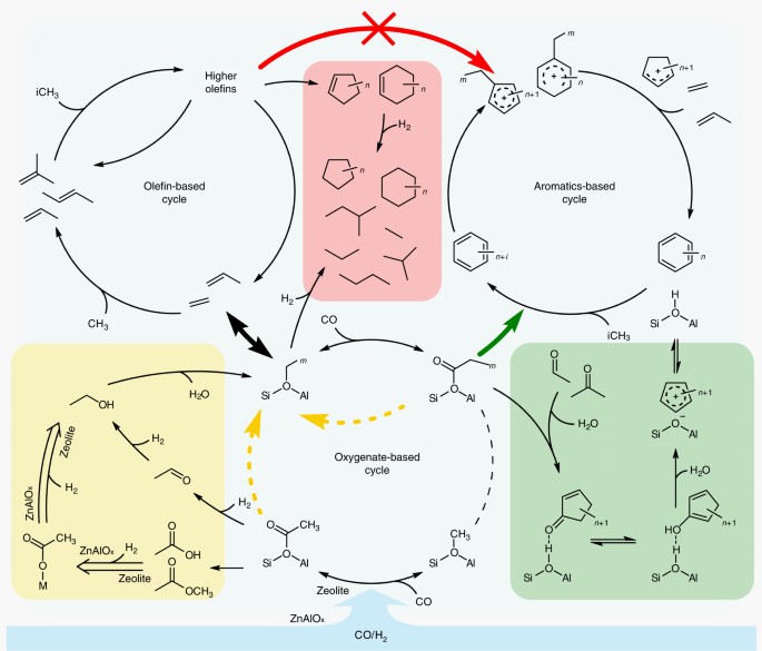 除了简单地生产 C1中间体外, 合成气还参与整个催化循环。合成气转化反应网络中的含氧化合物基循环发挥重要作用, 包括消耗 CO 和 H2, 并产生最终产物, 如烯烃(左下)和芳烃(右下)。加氢反应对常规 HCP 双循环(顶部和中间)形成不饱和产物具有反向作用。